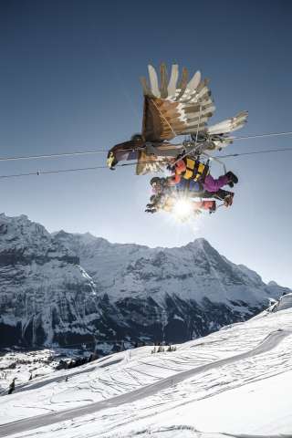 Mit einem Greifvogel zu fliegen, kann beglückend sein. Dann nämlich, wenn dich der Adler namens First Glider auf eine luftige Reise mitnimmt. Du schwebst dabei bäuchlings durch die Bergluft und geniesst Panorama und Tempo: Erst zieht dich der First Glider von Schreckfeld mit 72 Sachen rückwärts auf First. Auf dem Rückweg startest du dann mit dem Adler richtig durch. Er und seine Mitflieger sausen die 800 Meter lange Flugstrecke mit bis zu 83 Stundenkilometern hinunter.