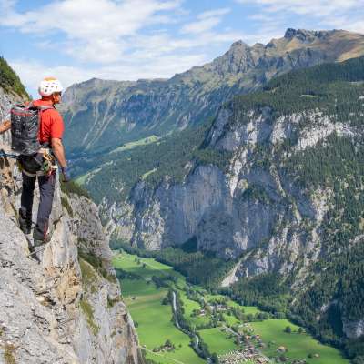 Unser Bergführer trifft dich beim Intersport Mürren-Schilthorn (Chalet Enzian) und rüstet dich mit dem technischen Material aus. Am Einstieg des Klettersteiges instruieren wir dich über die Klettersteigtechnik mit einem Safety Briefing. Nun geht es los! Der Einstieg ist einfach, doch schon bald werden wir an der „Hammerecke“ die sensationell eindrückliche Mürrenfluh unter den Füssen haben… Vorbei an der Basejumpplattform erwartet uns die Tyrolienneseilbahn, wir schweben direkt über den Mürrenbach auf die andere Seite der Felswand. Zum Abschluss überqueren wir die Hängebrücke über die Schlucht, unter uns ca. 400 Meter Luft… Gratulation, geschafft! Von Gimmelwald aus reisen wir mit der Luftseilbahn zurück nach Mürren oder ins Tal nach Stechelberg.
