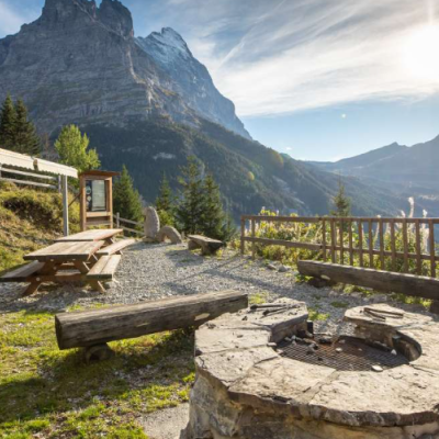 Ein ausfahrbares Sonnensegel schützt vor der Mittagssonne. Das absolute Highlight der Feuerstelle ist die ungestörte Aussicht über Grindelwald, die Eigernordwand sowie First.