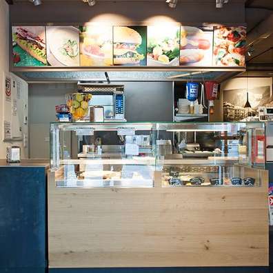 Eine breite Palette an Speisen wie z. B. Hamburger vom Grill, Sandwiches, Pizza, Kuchen, Süssigkeiten sowie warme und kalte Getränke stehen zur Auswahl. Für ganz Eilige gibt es alle Speisen und Getränke auch zum Mitnehmen.